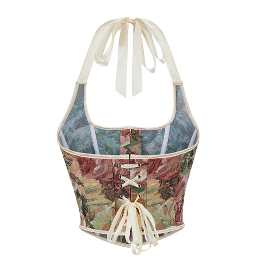 Sexy Women Corset Crop Tops Gothic Deep Red Printed Halter Backless Bustier Retro Body Shaper Lingerie Overbust Bustiers