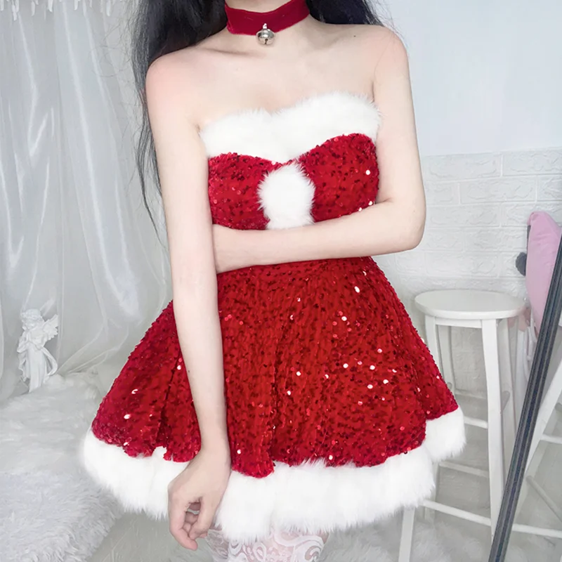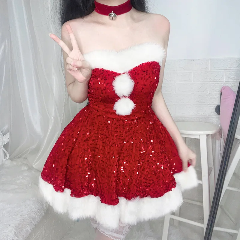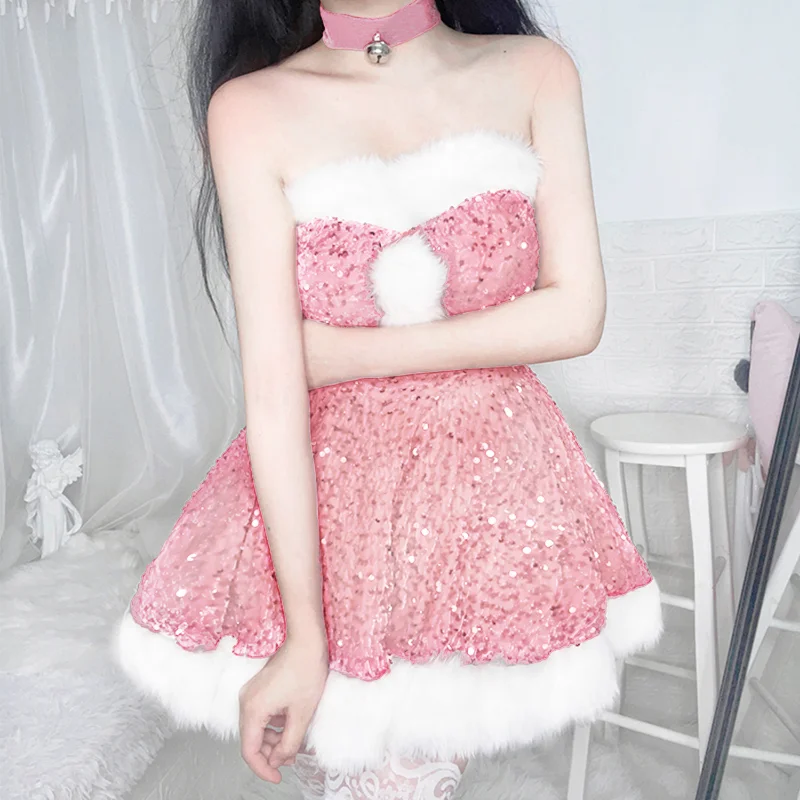 2024 Christmas Dress Sexy Pink Red Sequins Lingerie Dress Bunny Girl Off Shoulder Anime Santa Claus Princess Cosplay Costumes