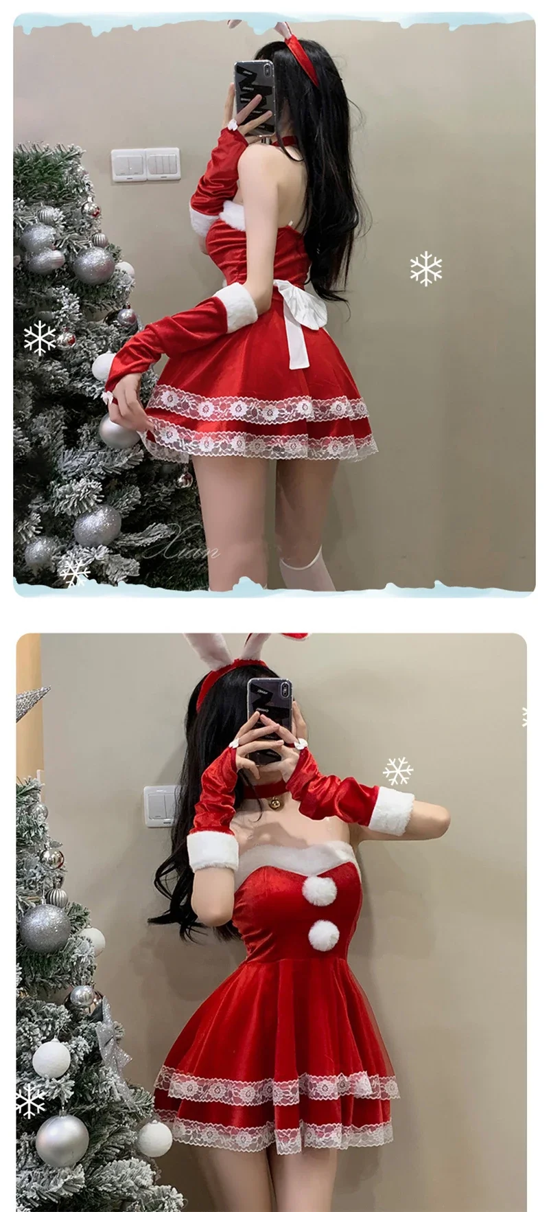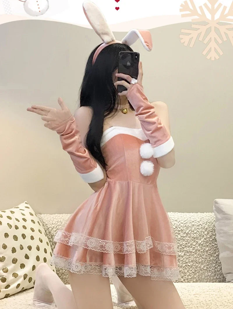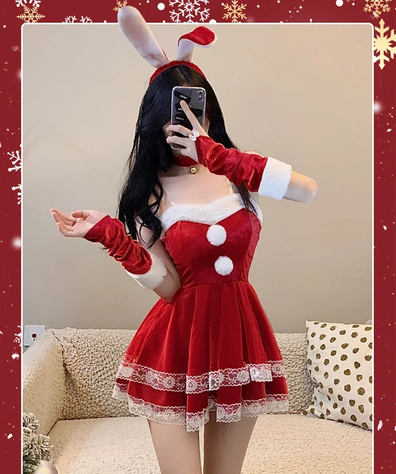 Christmas red woman dress sweet bunny girl costume rabbit woman set bunny suit sexy lingeries Lady cosplay New Year maid uniform