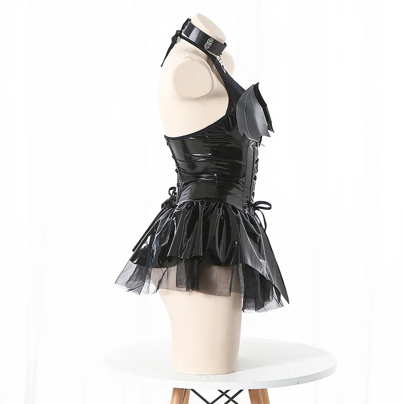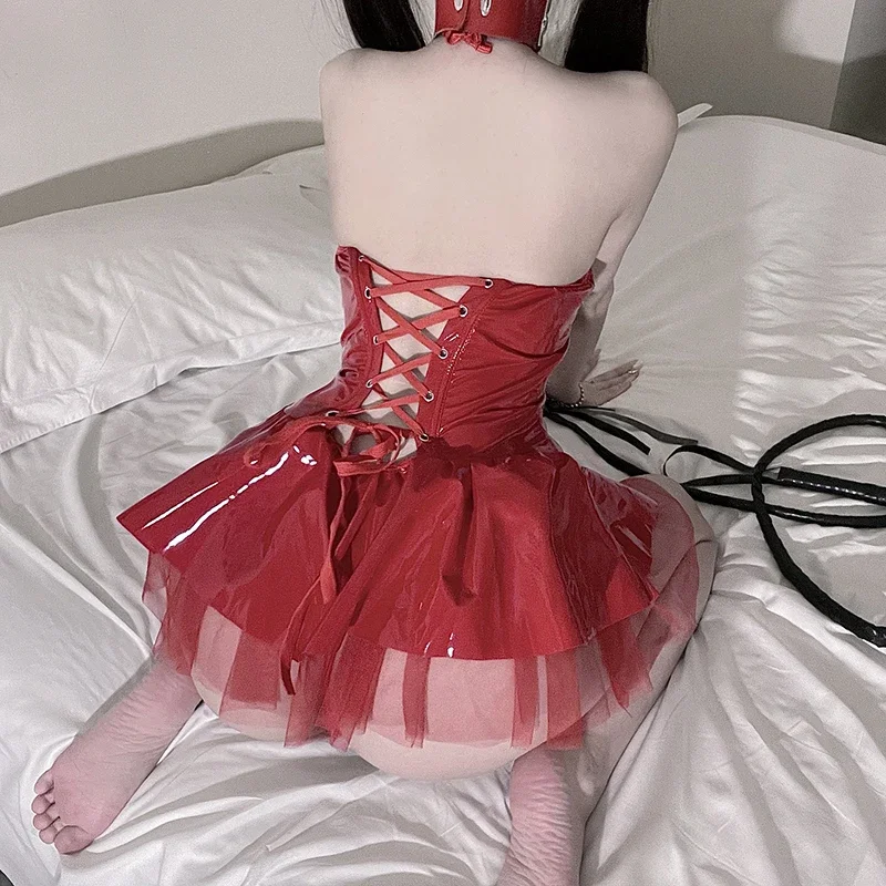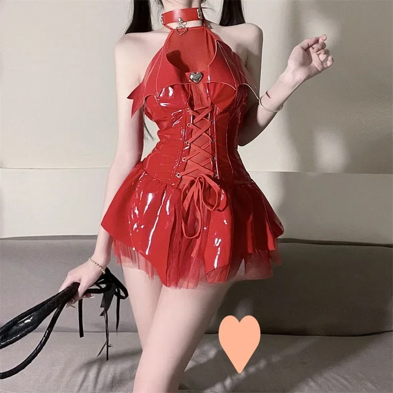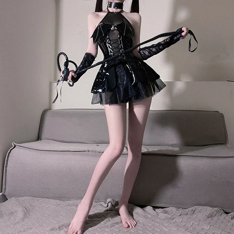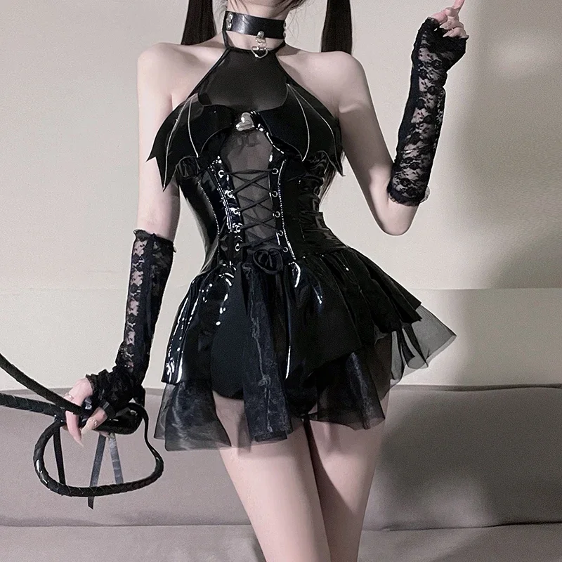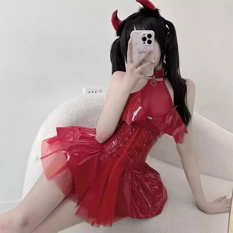Kawaii Evil Demon Cosplay Costume Black Red Pu Leather Shiny Bat Wings Sexy Lingerie Uniform Dress Halloween Costumes For Women