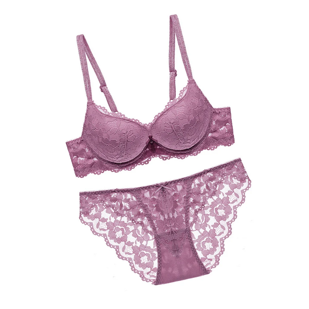 Lace Bra Panties Set Push up Adjustable Girls Underwear Hollow Breathable Lingerie, Wine Red, 32/70B
