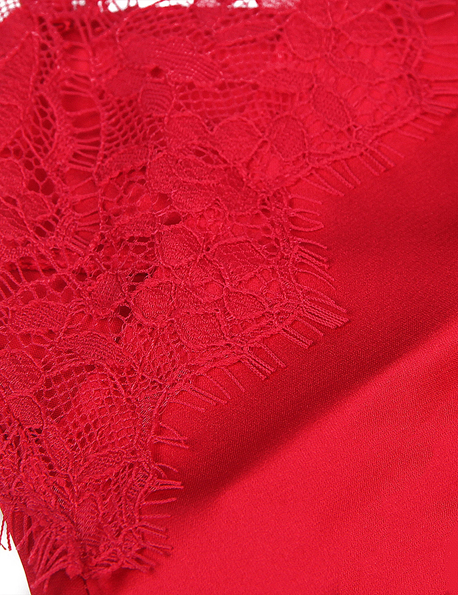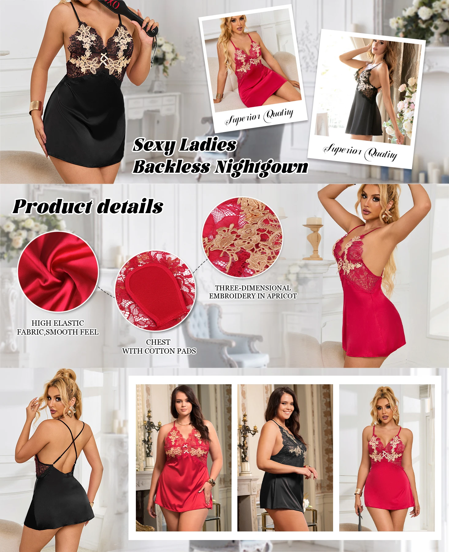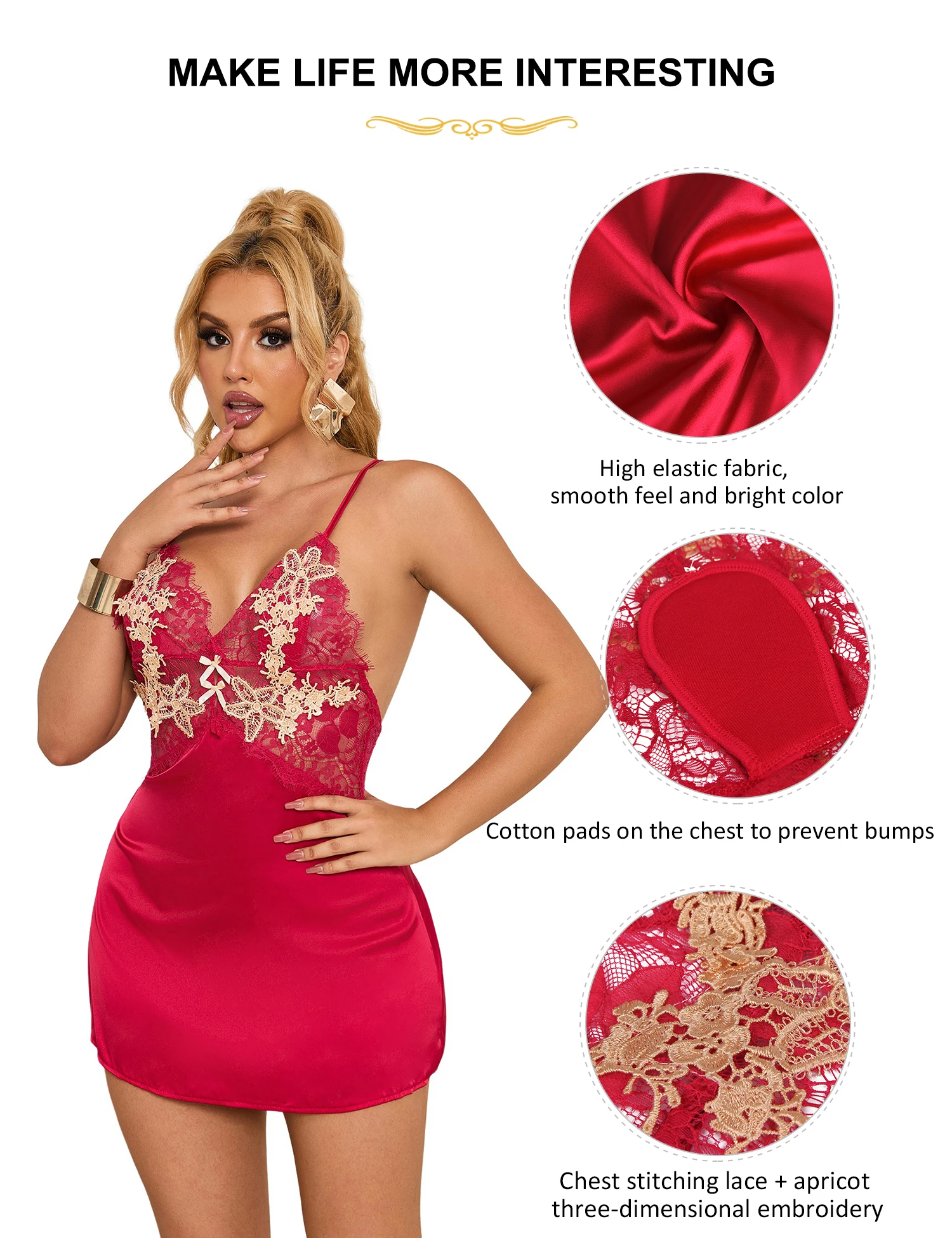 Ohyeahlady Floral Embroidery Women's Nightgowns Red Lace Sleepwear Nightie Dress Smooth Strappy Plus Size Sexy Babydoll Lingerie