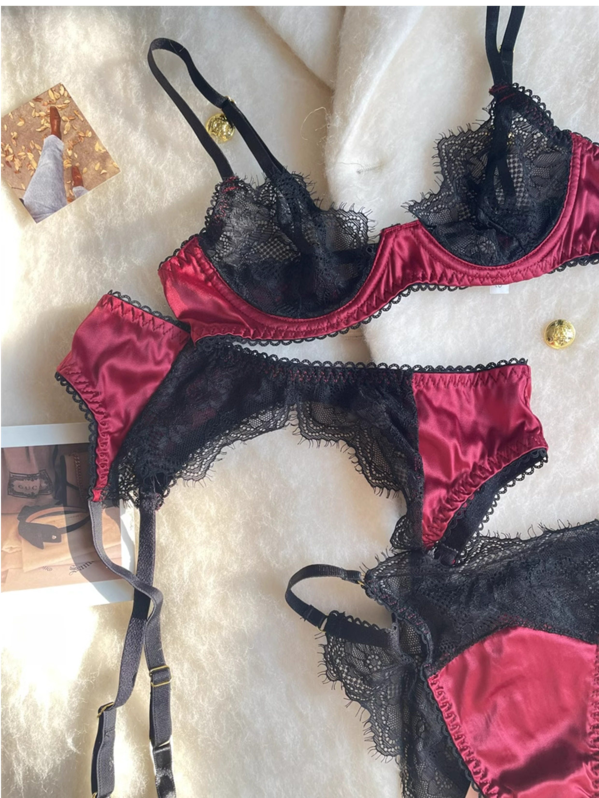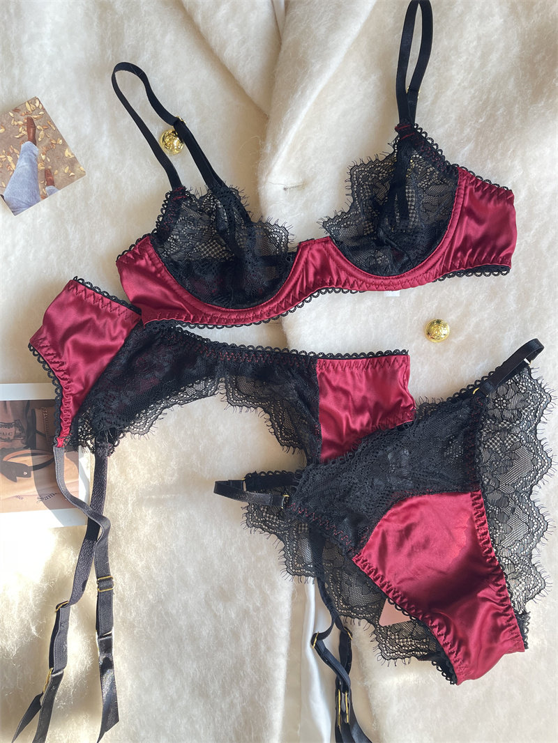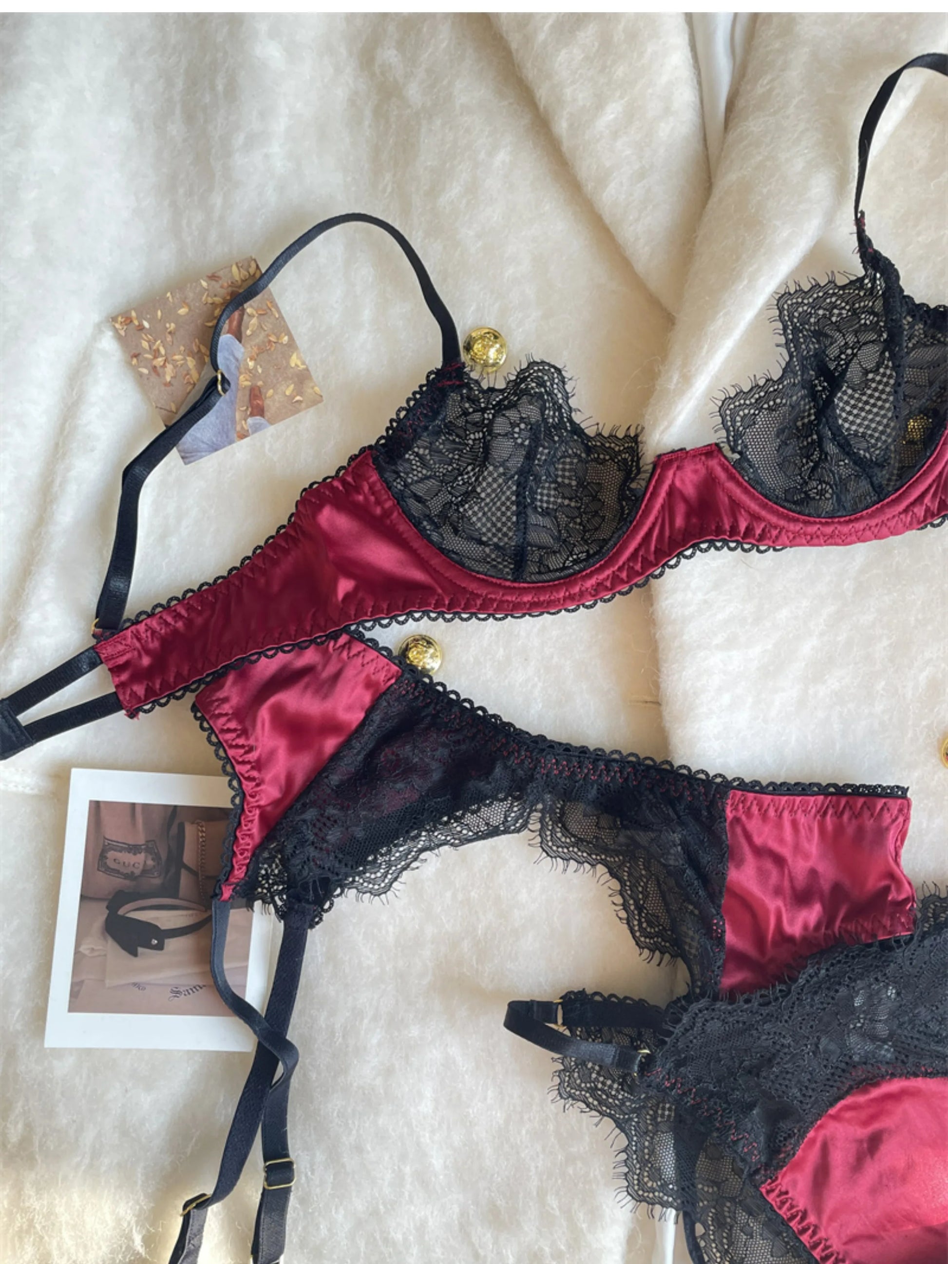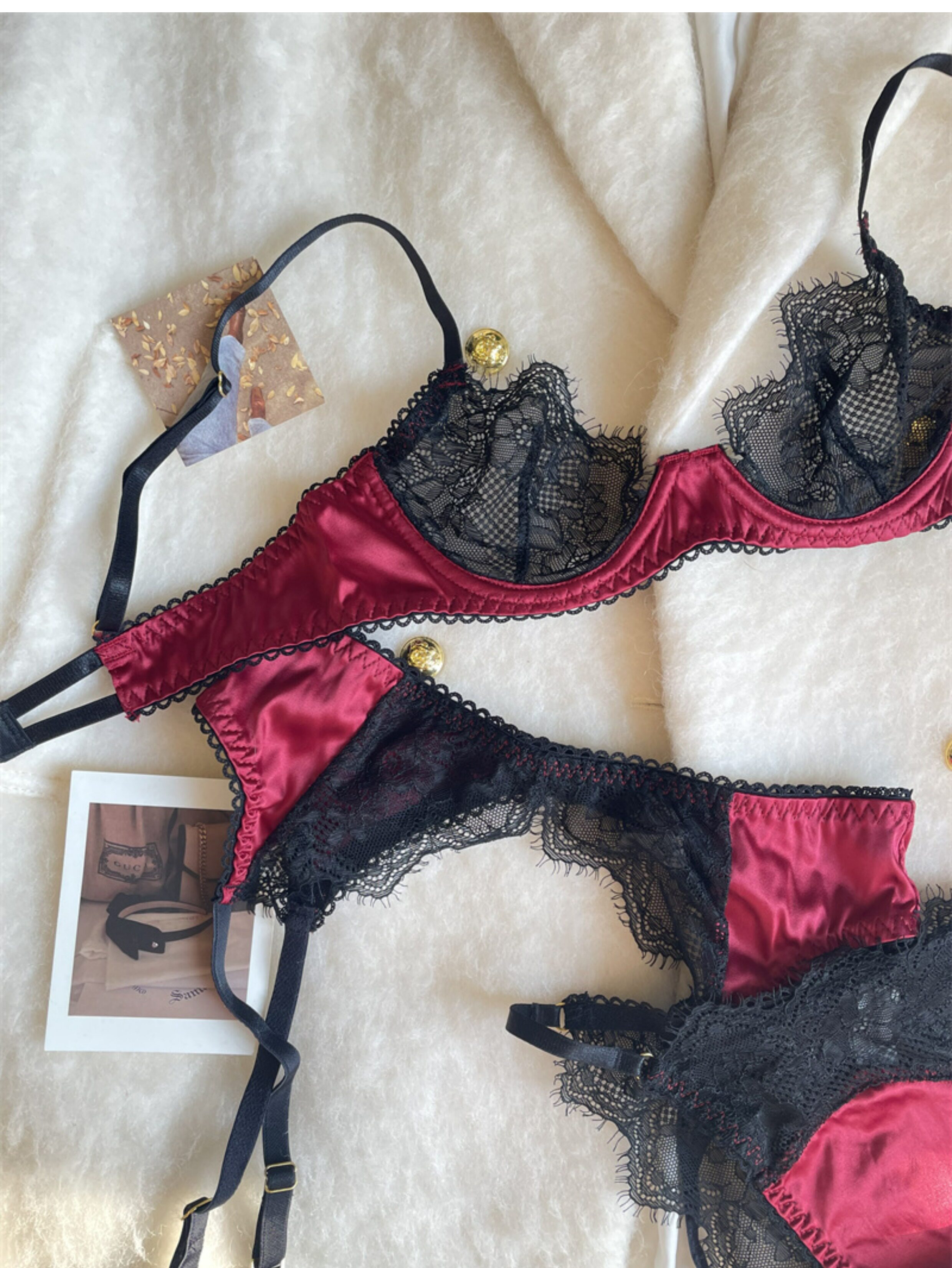 Sexy lace small breasts couple fun lingerie waistband panties three-piece set of red satin steel ring gathered bra