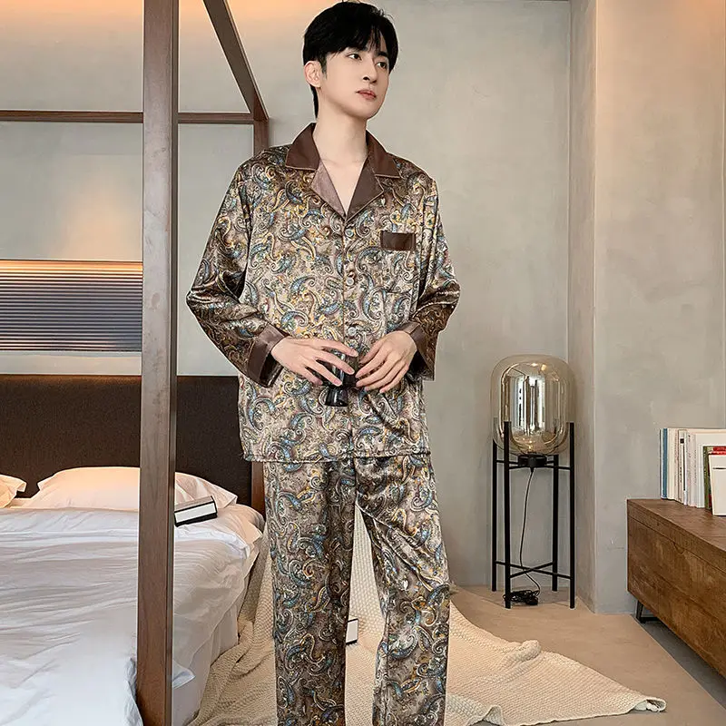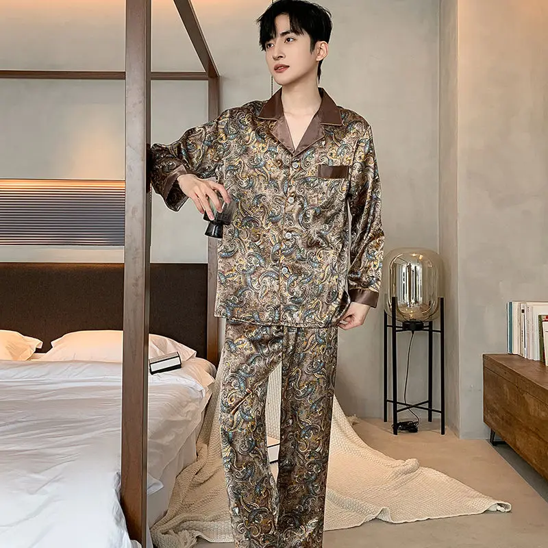 Spring and Autumn Men's Pajamas New Korean Version Long Sleeve Thin Ice Silk Summer Youth Home Wear Silk Set Large Size Comfort