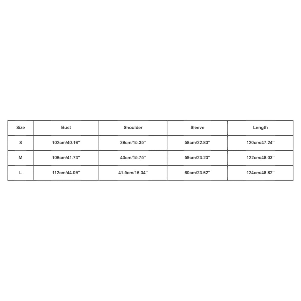 | Size:S | Bust:102cm/40.16'' | Shoulder:39cm/15.35'' | Sleeve:58cm/22.83'' | Length:120cm/47.24'' |